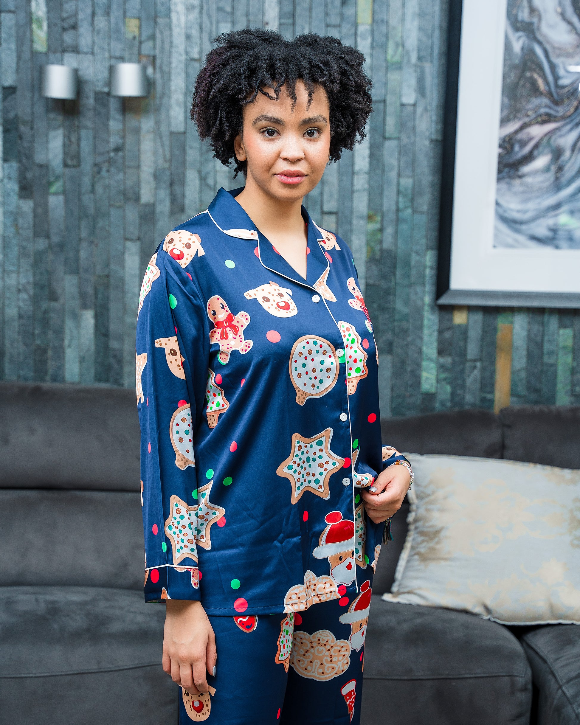 Crafted from soft satin in a rich navy blue base, this long-sleeve, long-trouser set is sprinkled with whimsical gingerbread men, Christmas trees, and festive motifs in classic holiday colours. Designed for cozy winter nights, holiday mornings, or festive lounging at home, it combines comfort, joy, and Seraphique’s signature touch of quiet luxury.