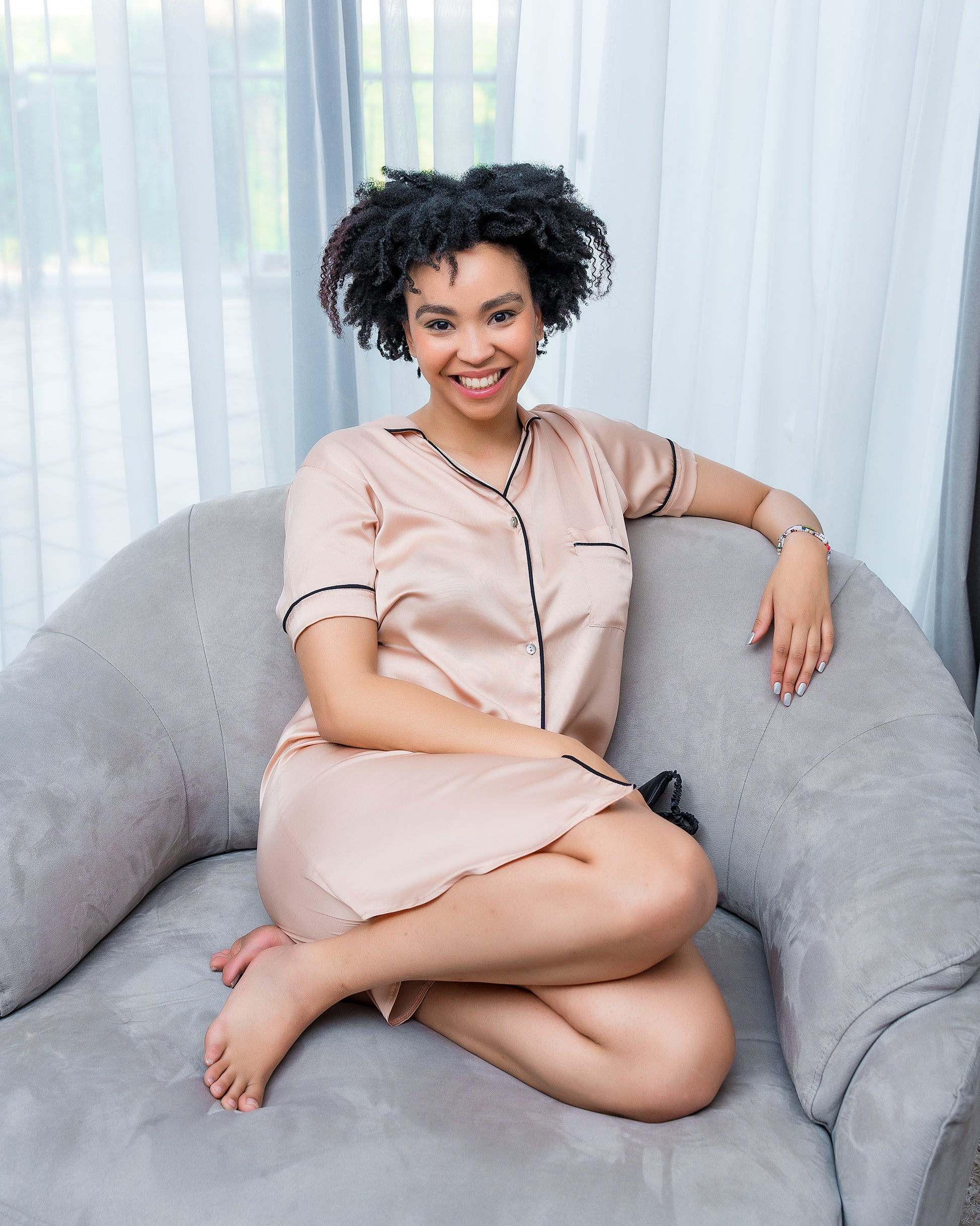 Grace meets ease in The Champagne Noir Nightshirt — a timeless silhouette reimagined in soft satin.