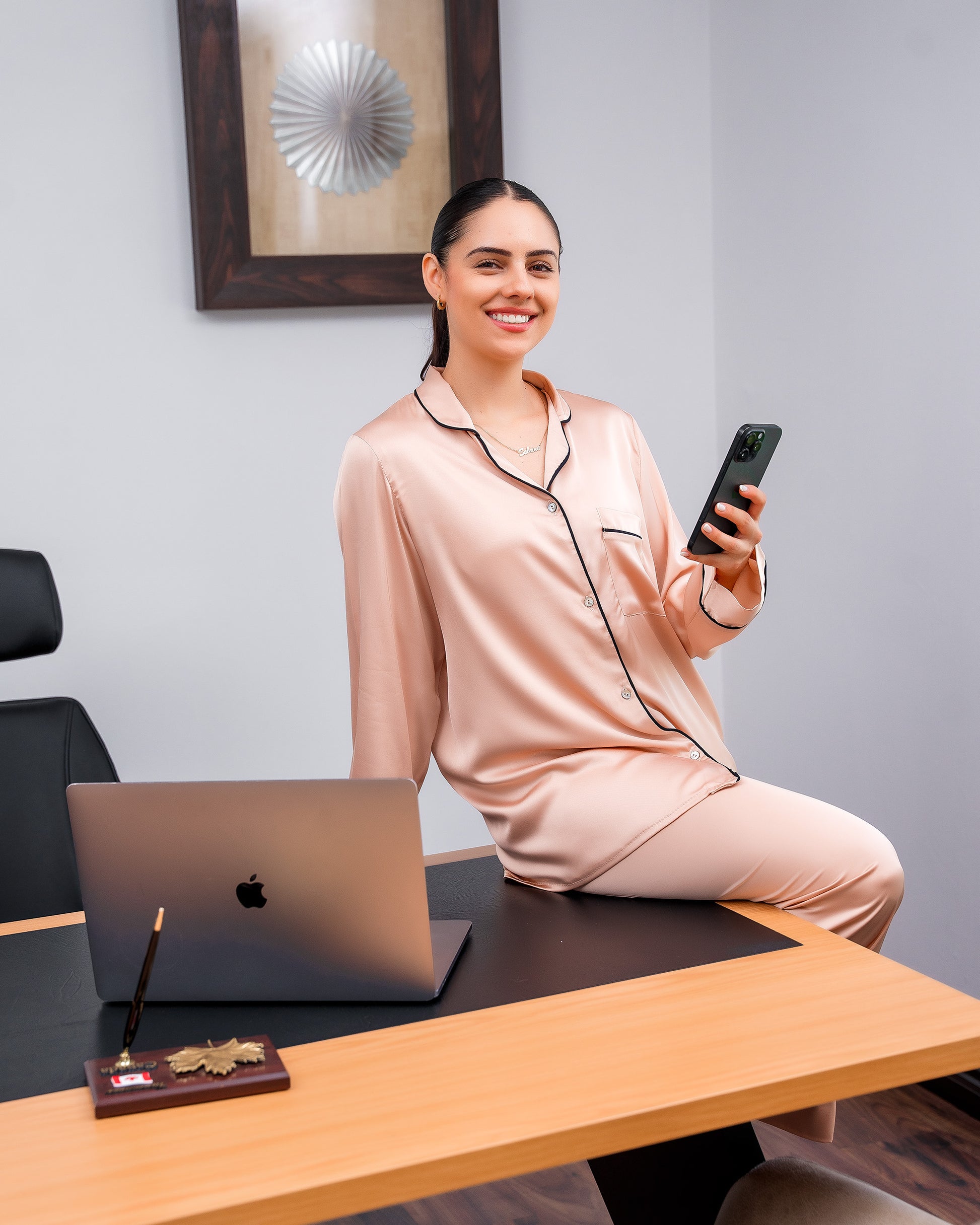 Crafted in smooth champagne satin with contrasting black piping, this long-sleeve, long-trouser set is designed for those who move through life with grace and ease.