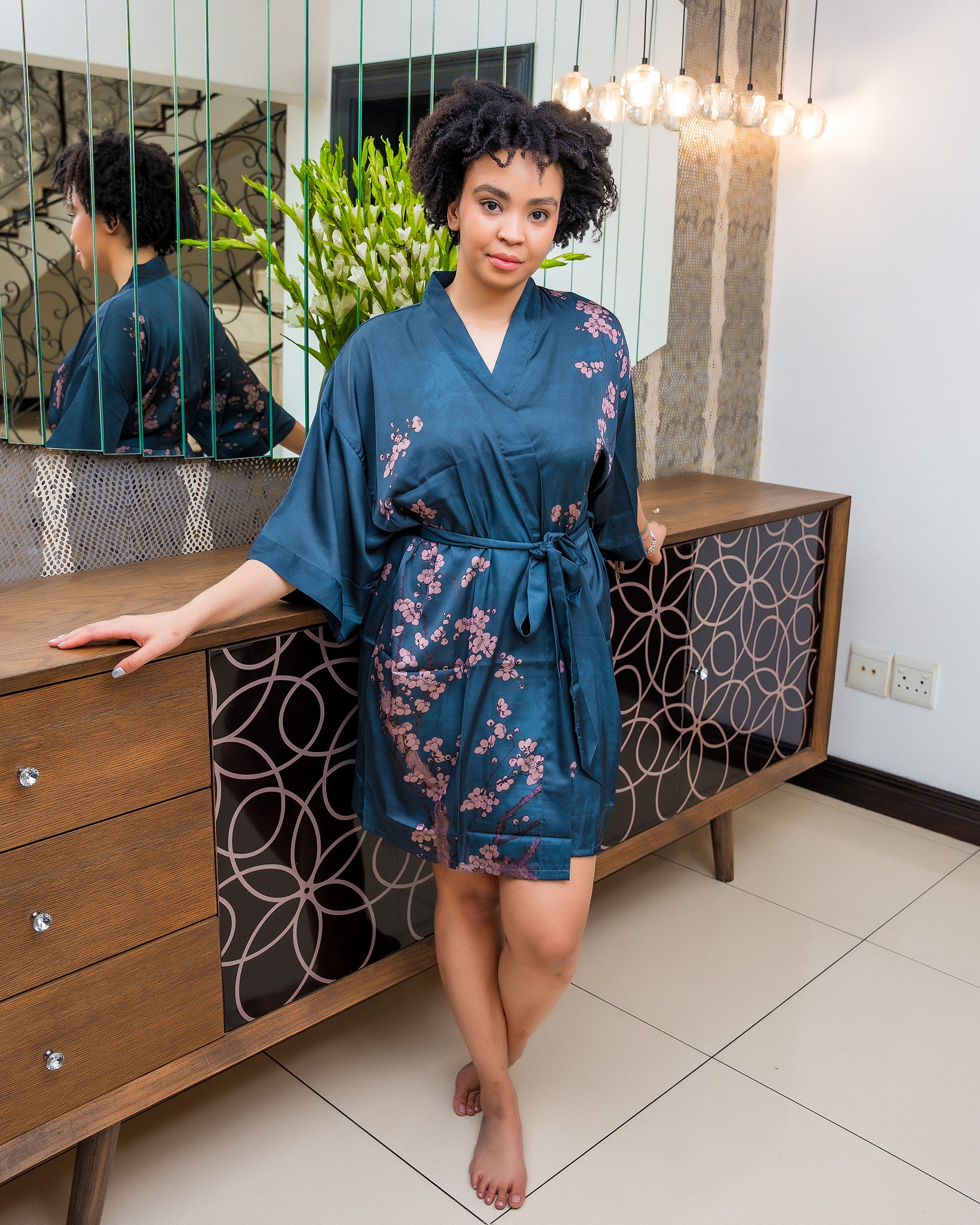 Set against a deep petrol blue satin, delicate baby pink cherry blossoms bloom across flowing fabric, each branch outlined in subtle purple tones for a whisper of depth and detail. The mid-thigh length and matching belt make it perfect for lounging, layering, or elevating your evening ritual.