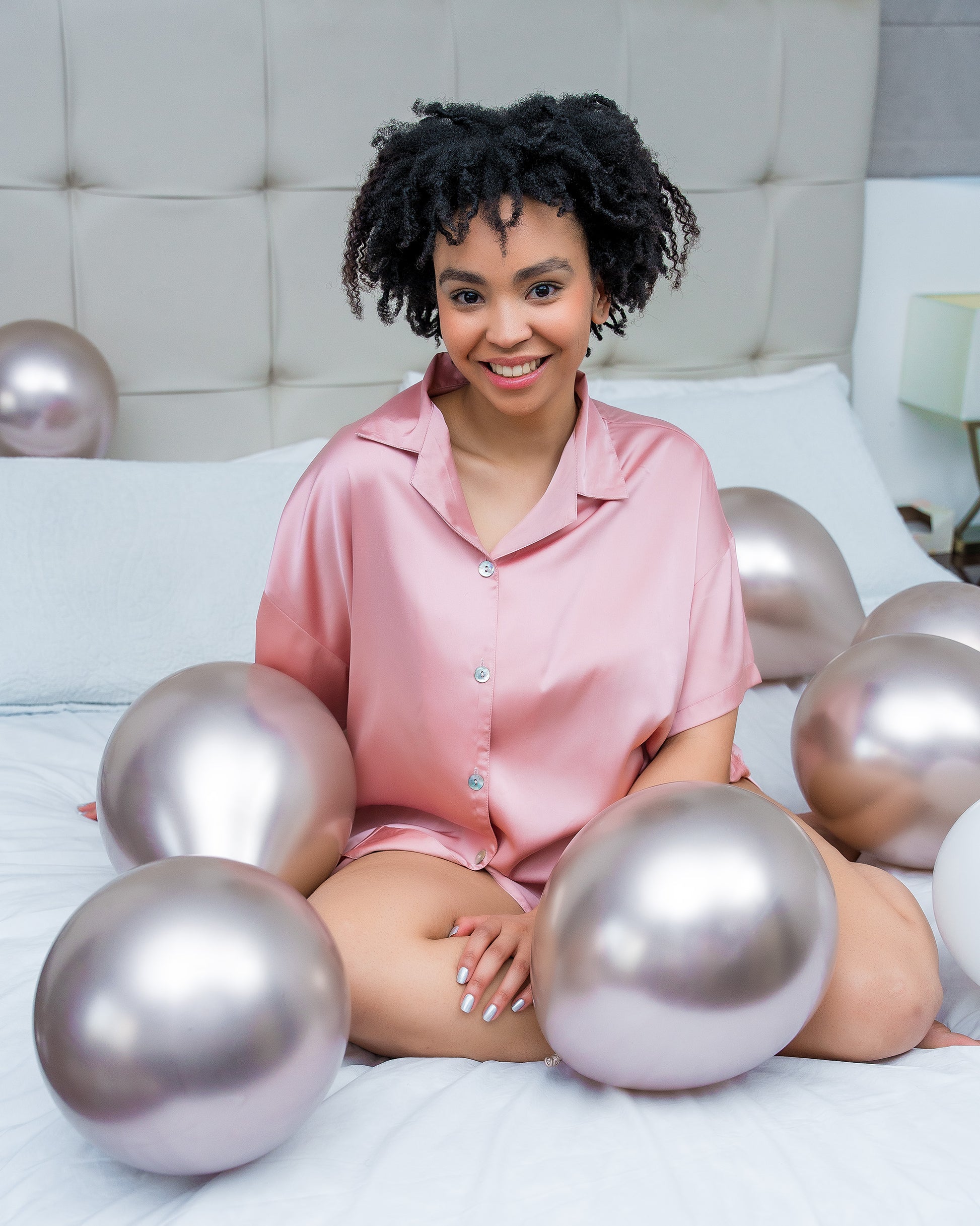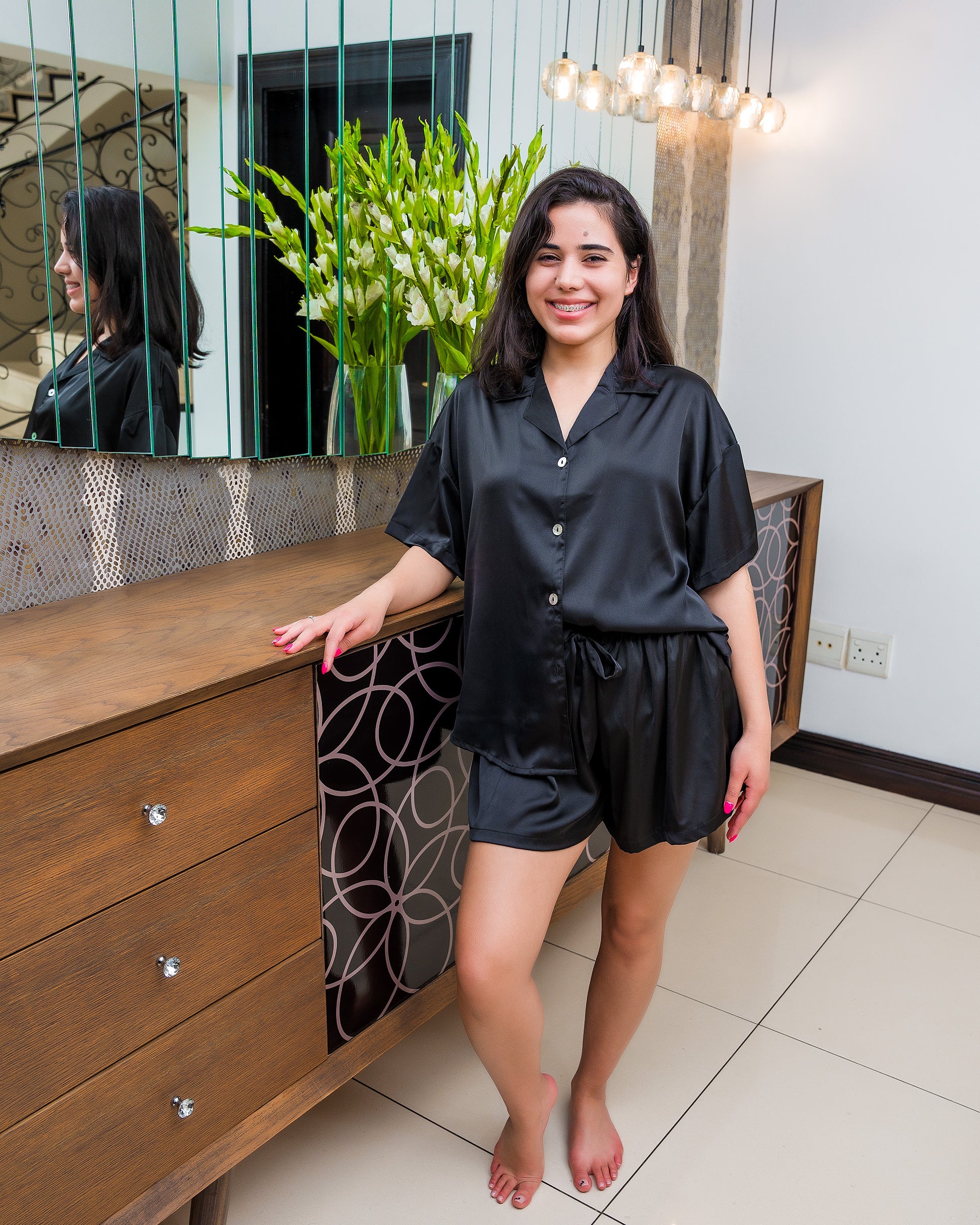 Featuring a softly structured button-up shirt and matching shorts, this set drapes beautifully for a flattering, easy fit — never slouchy, always sophisticated. Crafted from smooth satin in Champagne, Black, and Dusty Pink, it’s designed for slow mornings, soft evenings, and everything in between.